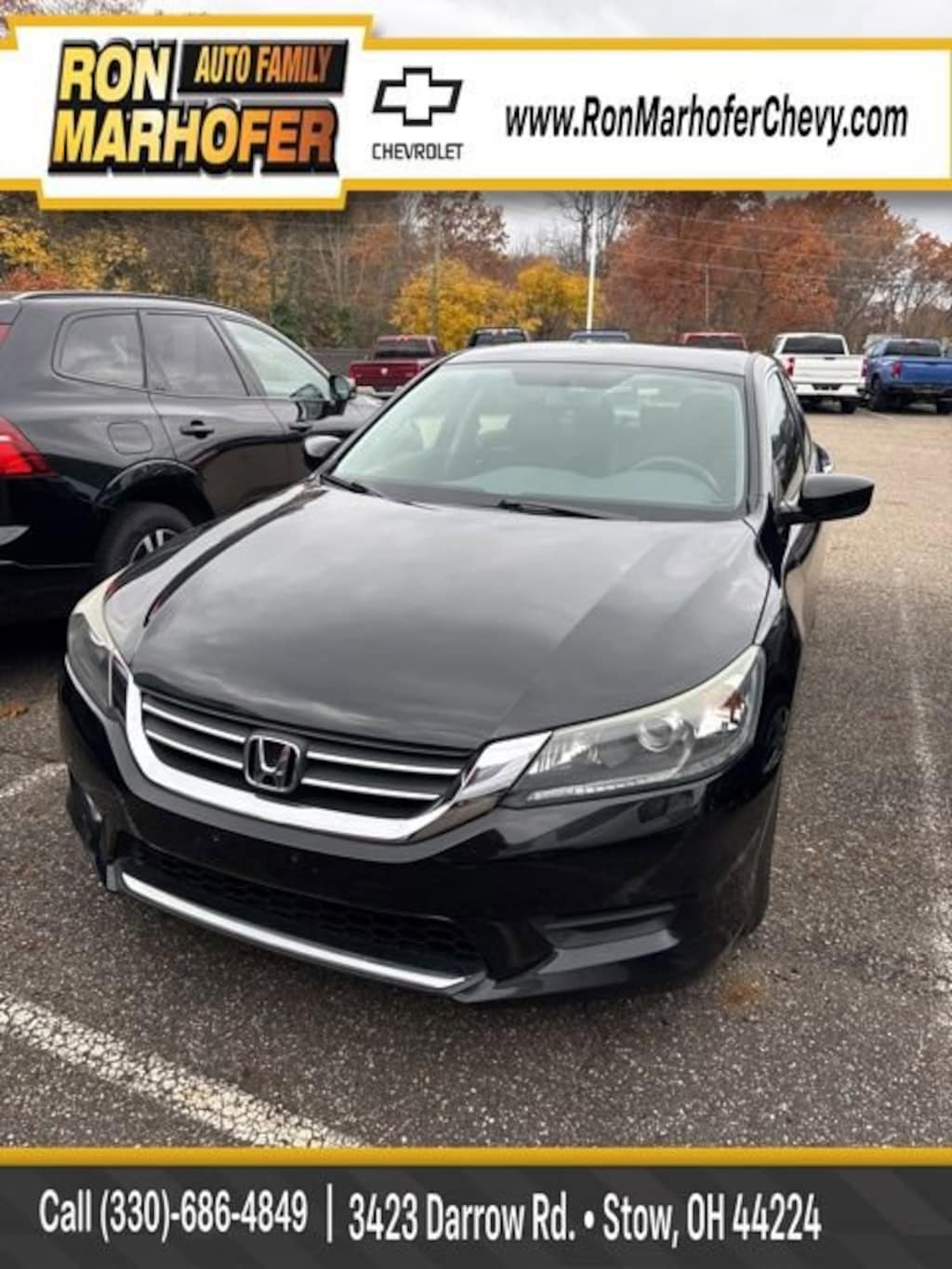 Ron Marhofer Chevrolet is proud to offer this terrific 2015 Honda Accord in . This 2015 Honda Accord has passed our comprehensive inspection and comes with the following features; Cloth, 16 Alloy Wheels, 160-Watt AM/FM/CD Audio System, 4 Speakers, 4-Wheel Disc Brakes, ABS brakes, Air Conditioning, Alloy wheels, AM/FM radio, Automatic temperature control, Brake assist, Bumpers: body-color, CD player, Cloth Seat Trim, Delay-off headlights, Driver door bin, Driver vanity mirror, Dual front impact airbags, Dual front side impact airbags, Electronic Stability Control, Exterior Parking Camera Rear, Four wheel independent suspension, Front anti-roll bar, Front Bucket Seats, Front Center Armrest, Front dual zone A/C, Front reading lights, Fully automatic headlights, Illuminated entry, Low tire pressure warning, Occupant sensing airbag, Outside temperature display, Overhead airbag, Overhead console, Panic alarm, Passenger door bin, Passenger vanity mirror, Power door mirrors, Power steering, Power windows, Radio data system, Rear anti-roll bar, Rear seat center armrest, Rear window defroster, Remote keyless entry, Security system, Speed control, Speed-sensing steering, Speed-Sensitive Wipers, Steering wheel mounted audio controls, Tachometer, Telescoping steering wheel, Tilt steering wheel, Traction control, Trip computer, and Variably intermittent wipers.Cloth.27/36 City/Highway MPGReviews:* Simple operation, great reliability and high resale value are obvious attractors to the Accord. But you may be surprised at the extent of its lineup, which ranges from an economical sedan to a V6-powered coupe or a hybrid rated up to 50 mpg. Itâs hard to go wrong in any of them. Source: KBB.com* Roomy and high-quality interior; refined and efficient powertrains; quick acceleration; responsive handling; generous standard features; available coupe body style. Source: EdmundsAwards:* 2015 IIHS Top Safety Pick * 2015 KBB.com Brand Image AwardsKelley Blue Book Brand Image Awards are based on the Brand Watch(tm) study from Kelley Blue Book Market Intelligence. Award calculated among non-luxury shoppers. For more information, visit www.kbb.com. Kelley Blue Book is a registered trademark of Kelley Blue Book Co., Inc.Ron Marhofer Chevrolet has a large selection of pre-owned cars, trucks and SUVâs. Each vehicle is thoroughly inspected and marked with our best, no hassle price up front.